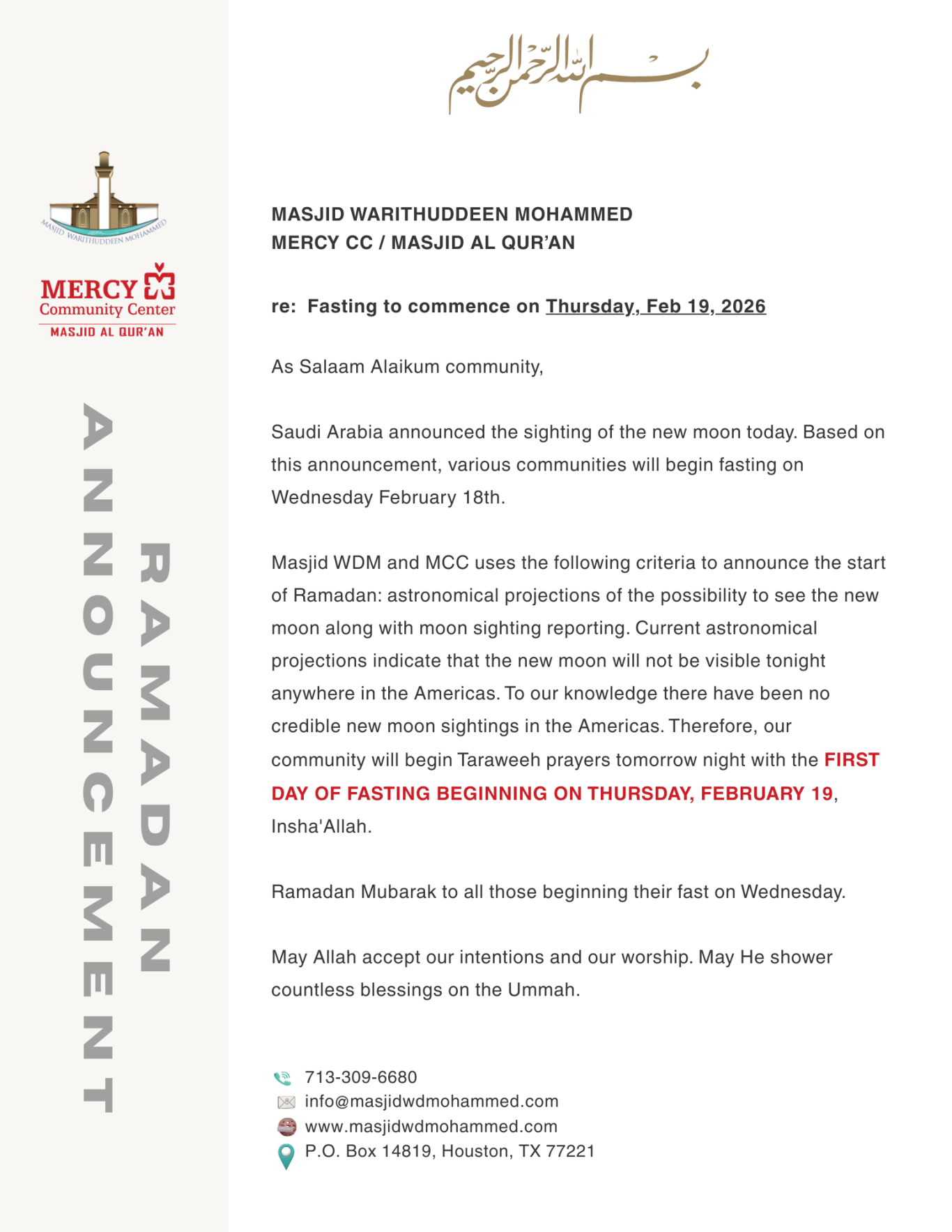 Insha'Allah, we will begin the fast of Ramadan on Thursday, February 19.